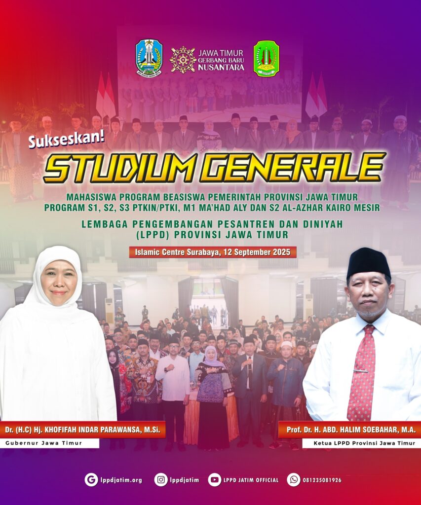 Surabaya-Sebanyak 10 Mahasiswa Baru Doktoral Program Pascasarjana Universitas KH Abdul Chalim (UAC) Pacet Mojokerto penerima beasiswa dari Lembaga Pengembangan Pesantren dan Diniyah (LPPD) Provinsi Jawa Timur mengikuti Stadium Generale yang digelar di Gedung Islamic Center Surabaya pada Jumat, 12 September 2025. Turut hadir dan mendampingi dalam acara ini Dr. KH. Mauhibur Rokhman, Lc., MIRKH (Rektor Universitas KH Abdul Chalim Mojokerto) dan Dr. Rahmat, M.Pd.I (Sekretaris Prodi S3 Pendidikan Agama Islam).