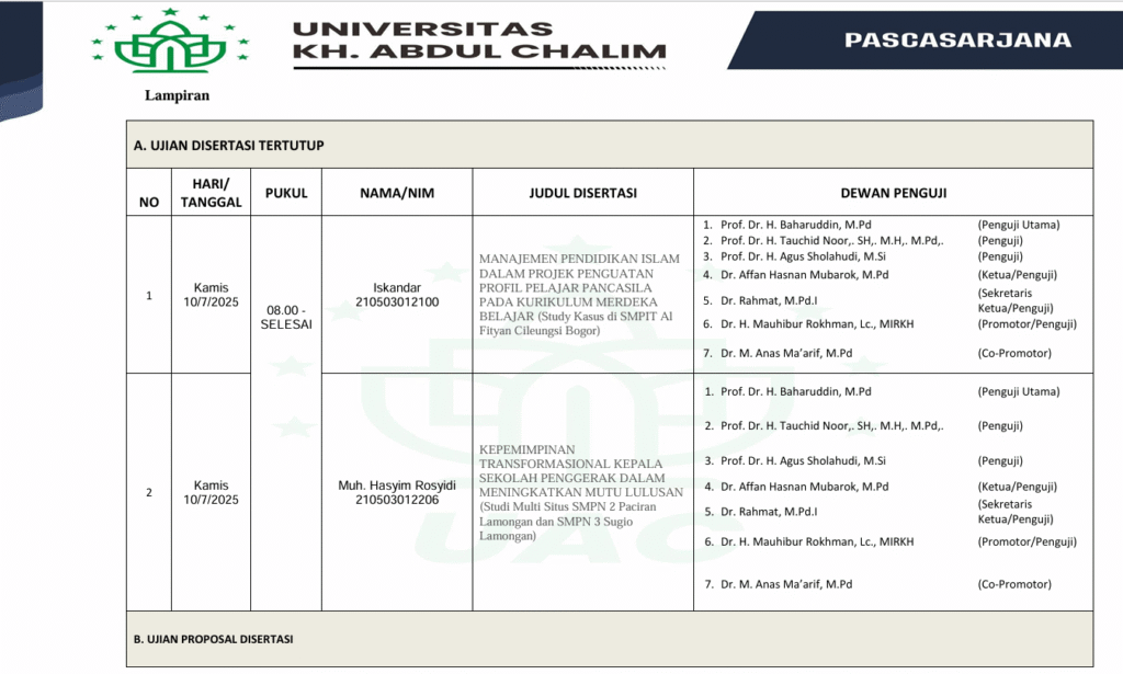 Mojokerto, 10 Juli 2025 – Program Studi S3 Manajemen Pendidikan Islam (MPI) Universitas KH. Abdul Chalim Mojokerto sukses menggelar ujian tertutup perdana sejak berdirinya prodi ini pada tahun 2022. Ujian ini menjadi tonggak sejarah penting dalam pengembangan akademik dan riset doktoral di bidang manajemen pendidikan Islam.